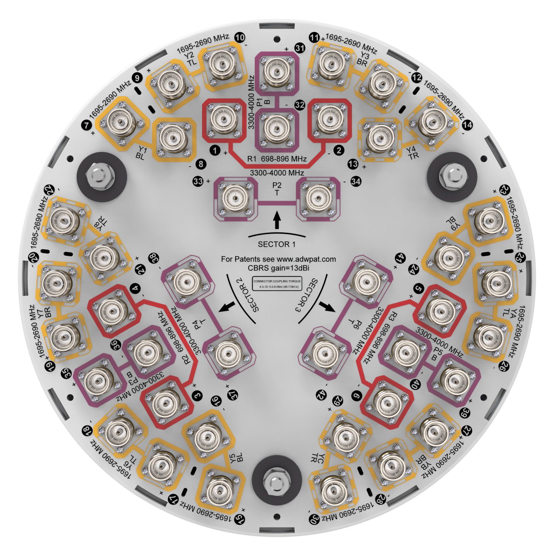 42-port Tri-sector antenna, 6x 698-896MHz, 24x 1695–2690MHz and 12x 3300- 4000MHz, 65° Horizontal Beamwidth, fixed tilt.