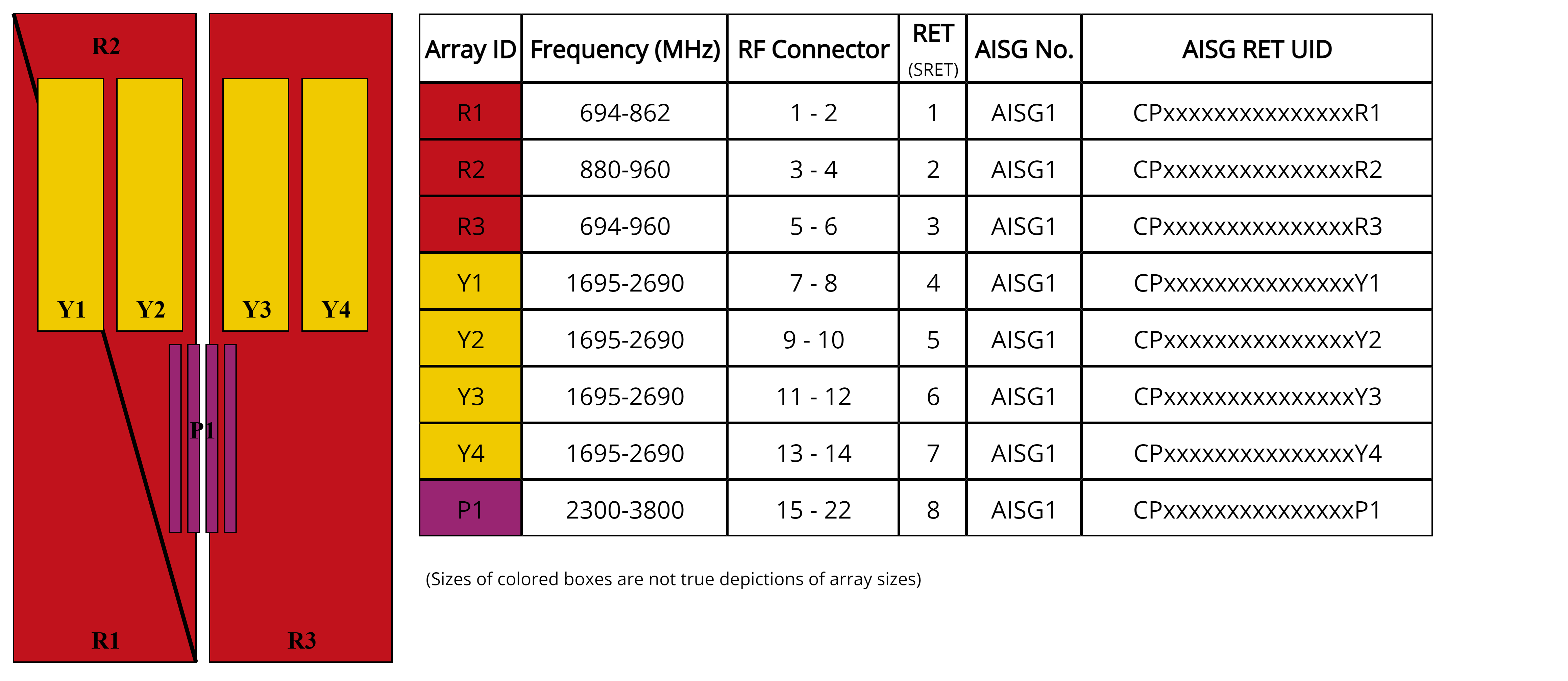 22-port sector antenna, 2 x 694-862 MHz (R1), 2 x 880-960 MHz (R2), 2 x 694-960 MHz (R3), and 8 x 1695-2690 MHz (Y1-Y4) 65° HPBW, 8 x 2300-3800 MHz (P1), 90° HPBW, 8 x RET
