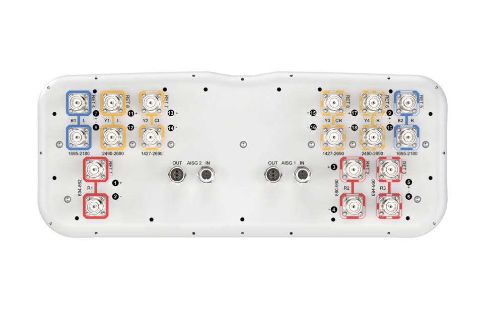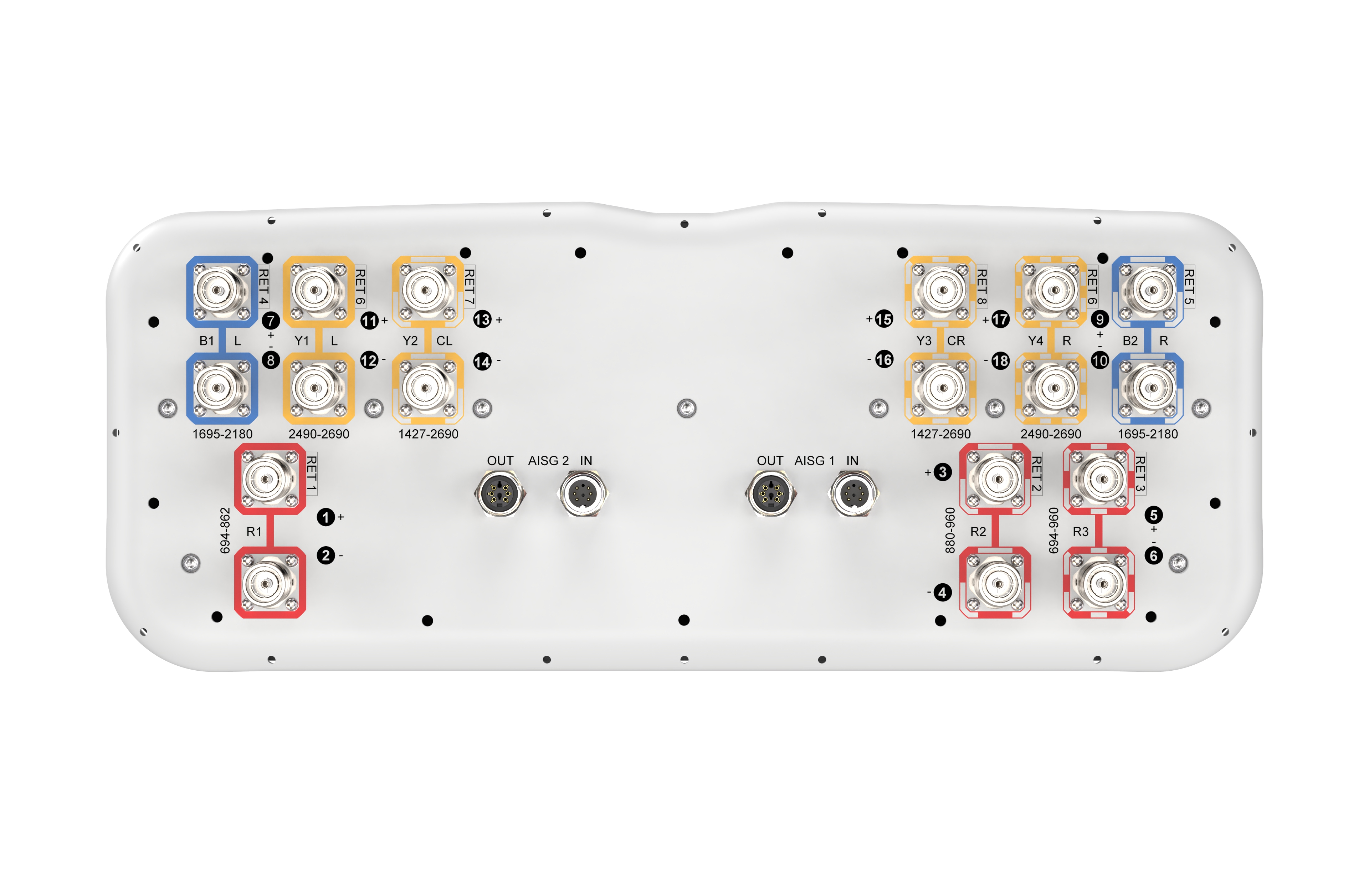 18-port sector antenna, 2x 694–862, 2x 880-960, 2x 694–960, 4x 1427–2690, 4x 1695-2180 and 4x 2490-2690 MHz, 65° HPBW, 8x RET