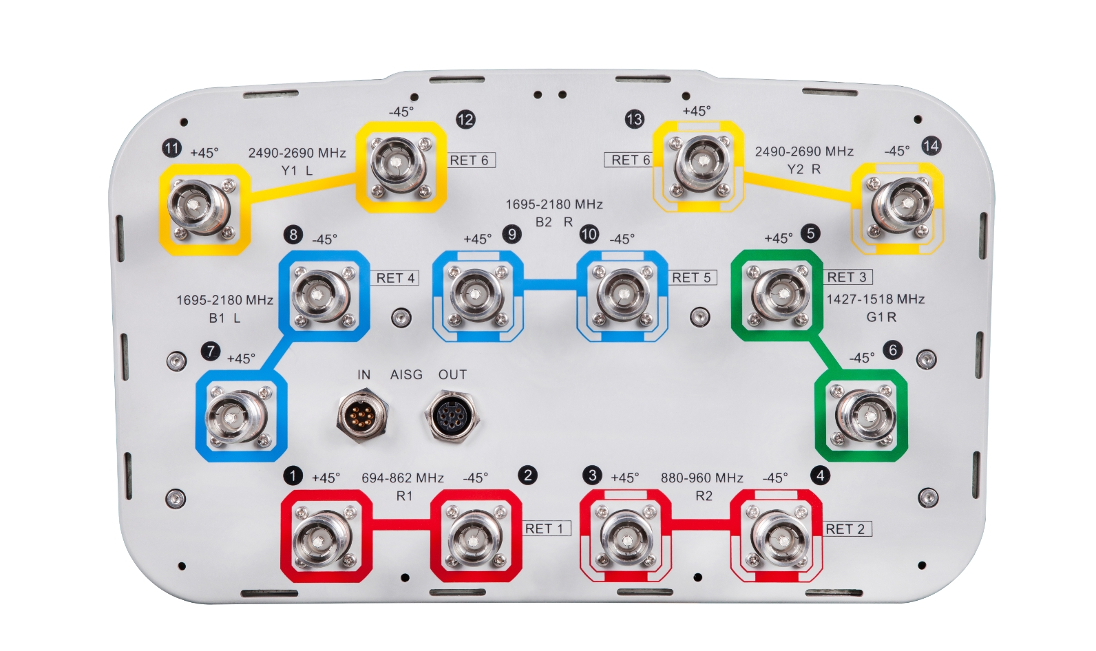 14-port, 1.5m, multiband antenna, RF port assignments are as follows: R1 = 694–862, R2 = 880–960, G1 = 1427-1518, B1 & B2 = 1695–2180 and Y1 & Y2 = 2490-2690 MHz, 65° HPBW, 6x RET. Y1 & Y2 share a common RET