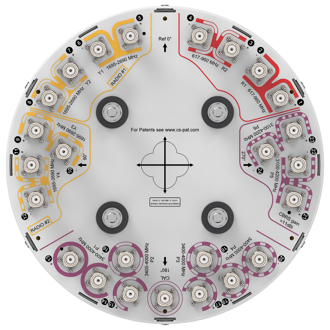24-port small cell antenna, 4x 617-960, 8x 1695-2690, 8x 3400-4000 MHz beamformer, 4x 3100-4200 MHz, 360° Horizontal Beamwidth, fixed tilt.