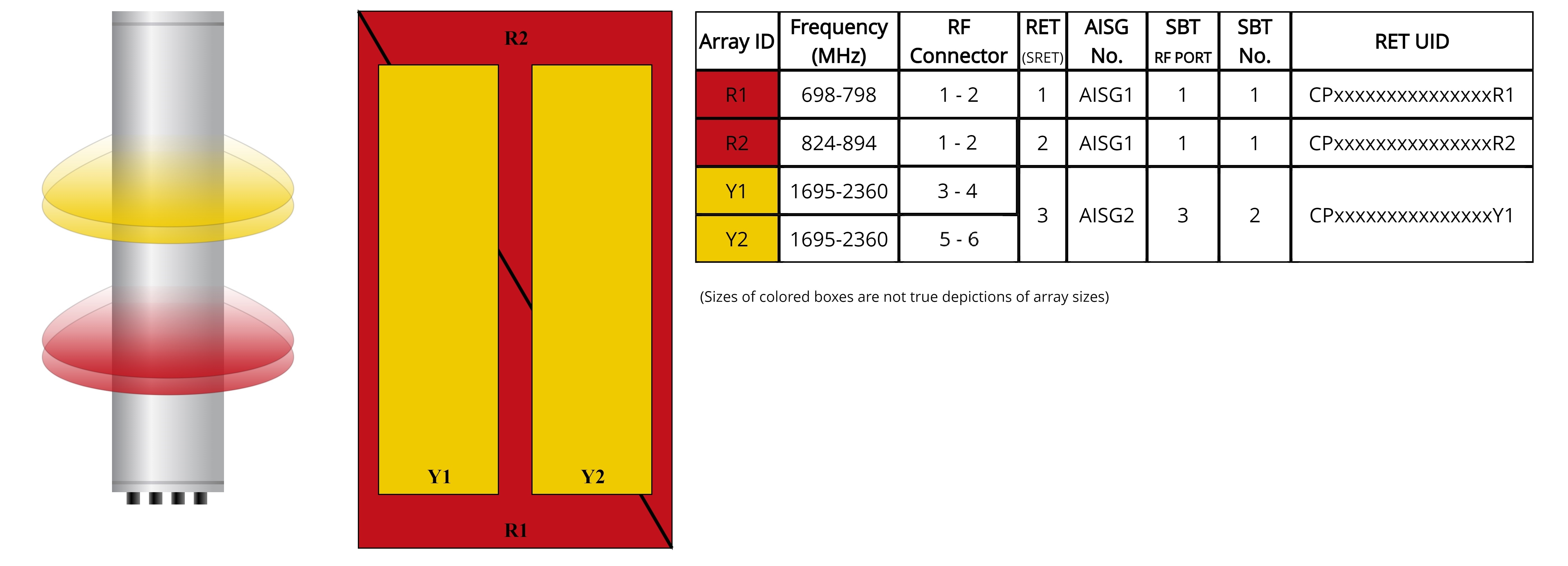 • Two LB RET and one MB RET. Both mid bands are controlled by one RET to ensure same tilt level for 4x MIMO
