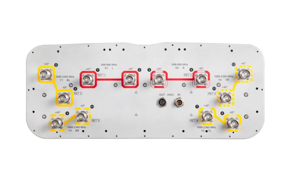 - Features broadband Low Band (698-896 MHz) and High Band (1695-2360 MHz) arrays for 4T4R (4X MIMO) capability for Band 14, AWS, PCS and WCS applications