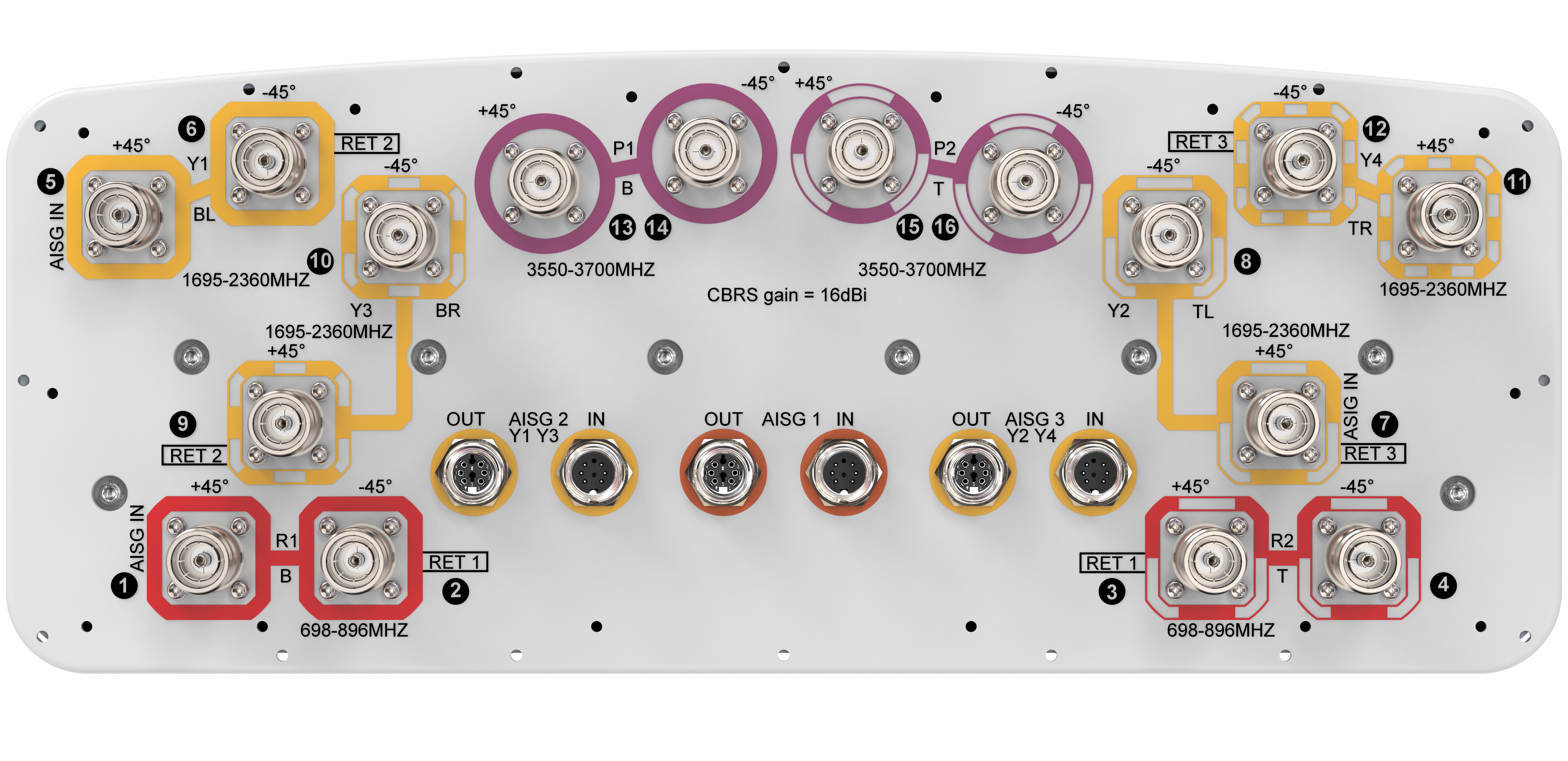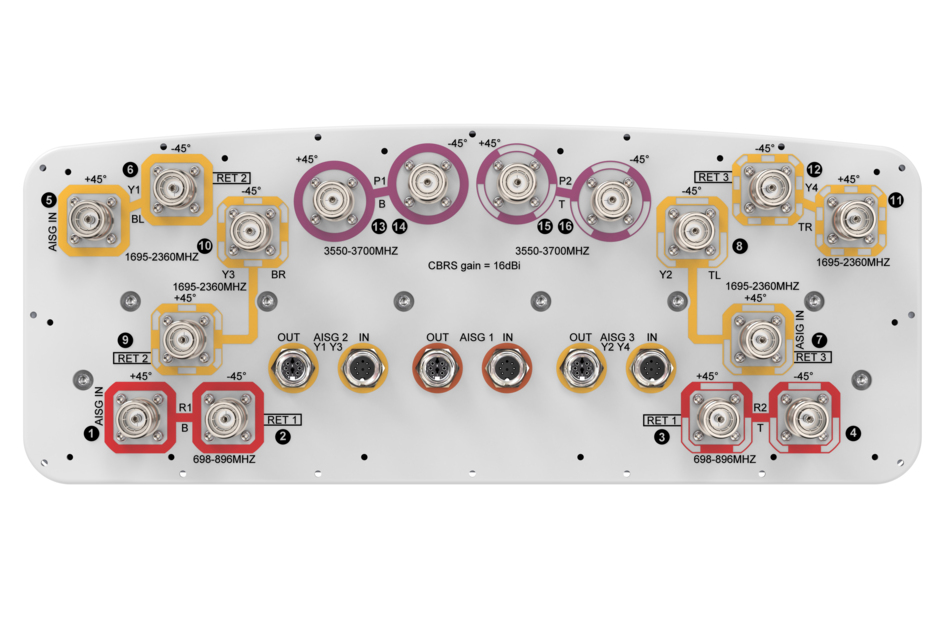 16-port sector antenna, 4x 698–896, 8x 1695–2360 and 4x 3550- 3700 MHz, 45° HPBW, 3x RETs and 3x SBTs.