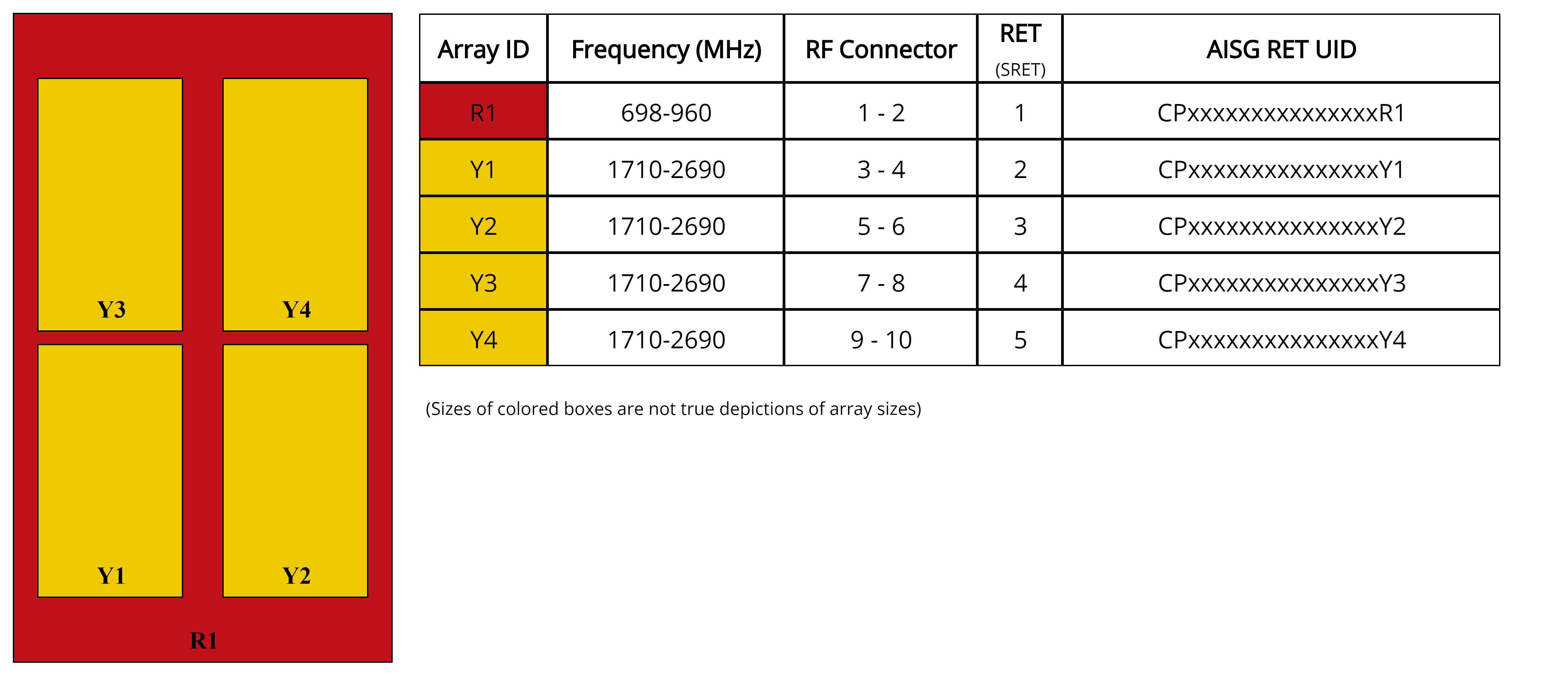 10-port sector/multi beam antenna, 2x 698-960 sector and 8x 1710-2690 multi beam, 65° sector and 33° 4x multi beam, 5x RET with tilt indicators