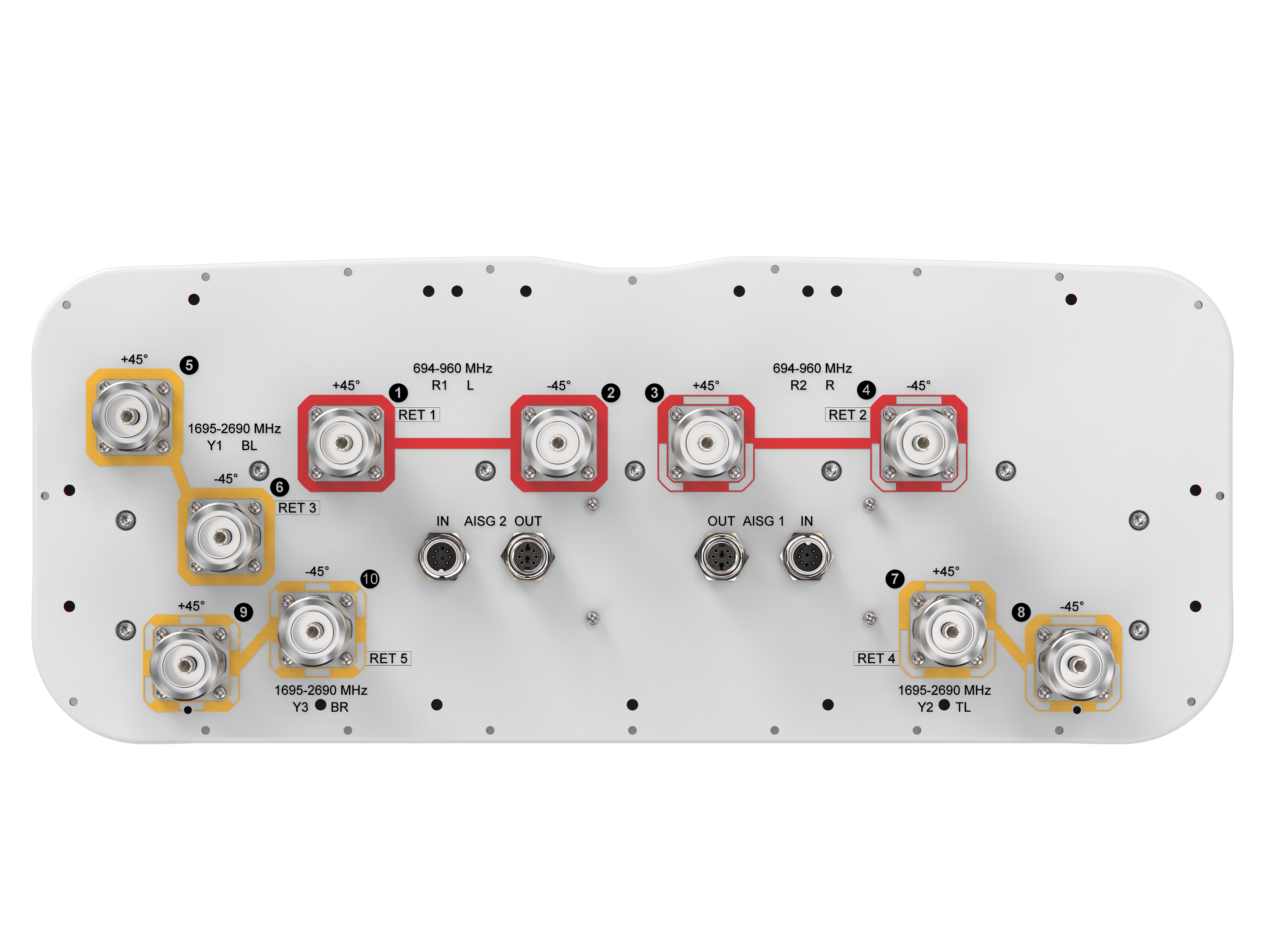 10-port sector antenna, 4x 694–960 and 6x 1695–2690 MHz, 65° HPBW, 5x RET
