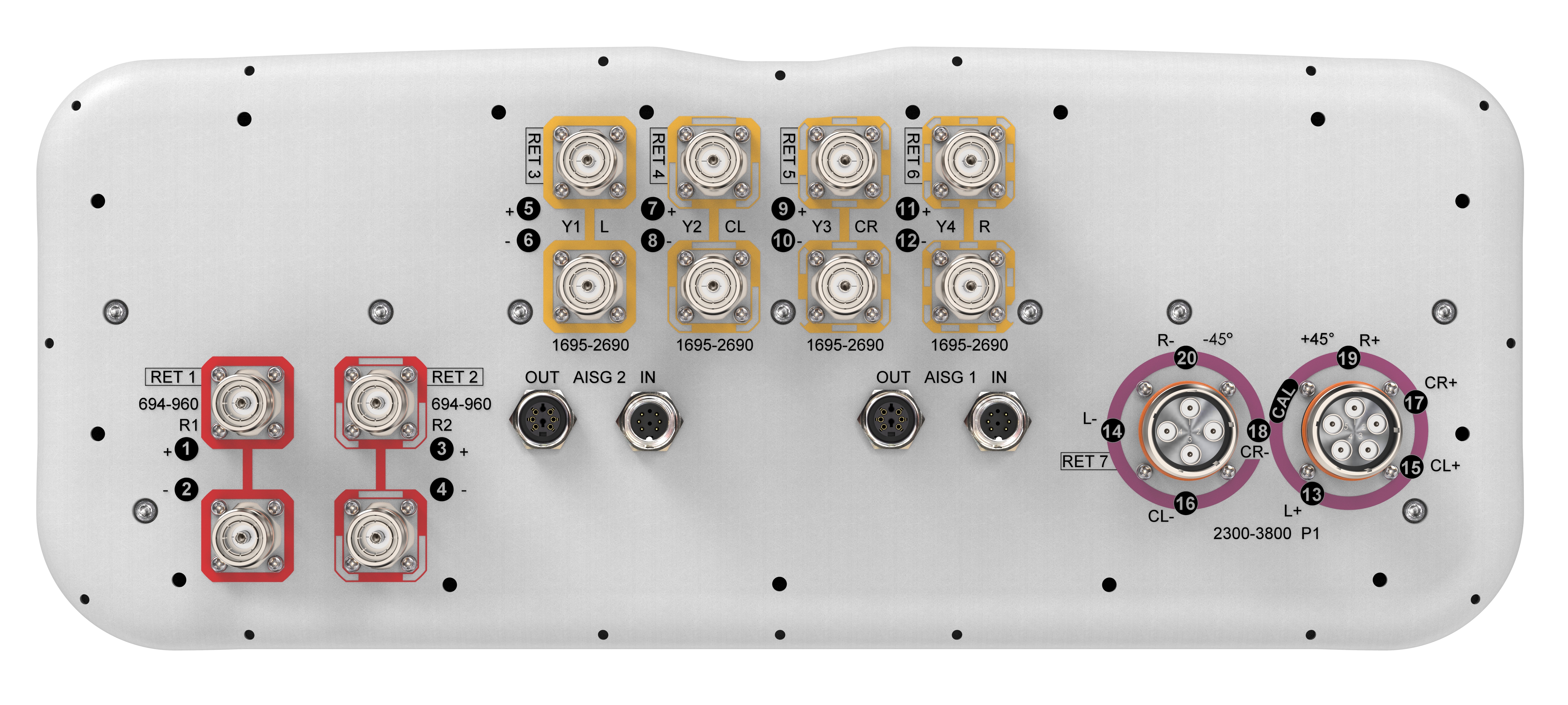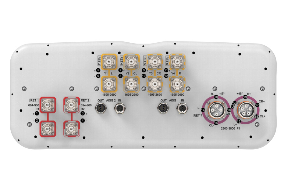 20-port sector antenna,4 x 694-960 MHz (R1-R2), and 8 x 1695-2690 MHz (Y1-Y4), 65° HPBW, 8 x 2300-3800 MHz (P1), 90° HPBW, 7 x RET