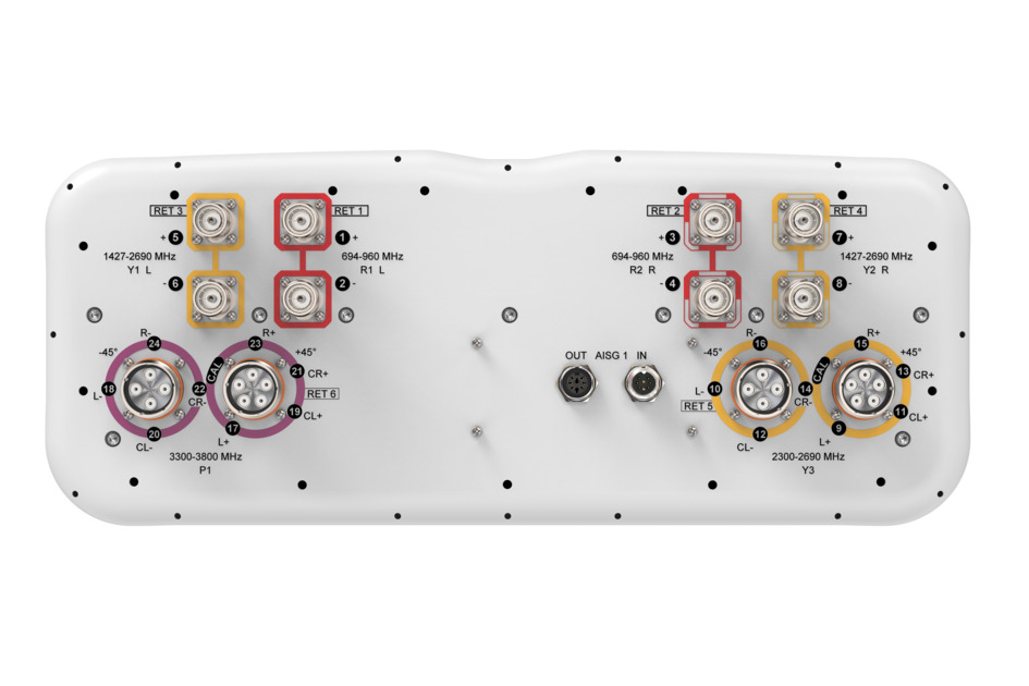 24-port sector antenna, 4x 694–960 and 4x 1427-2690 MHz 65° HPBW, 8x 2300–2690 and 8x 3300-3800MHz, 90° HPBW, 6x RET with MQ4 /MQ5 cluster connectors.