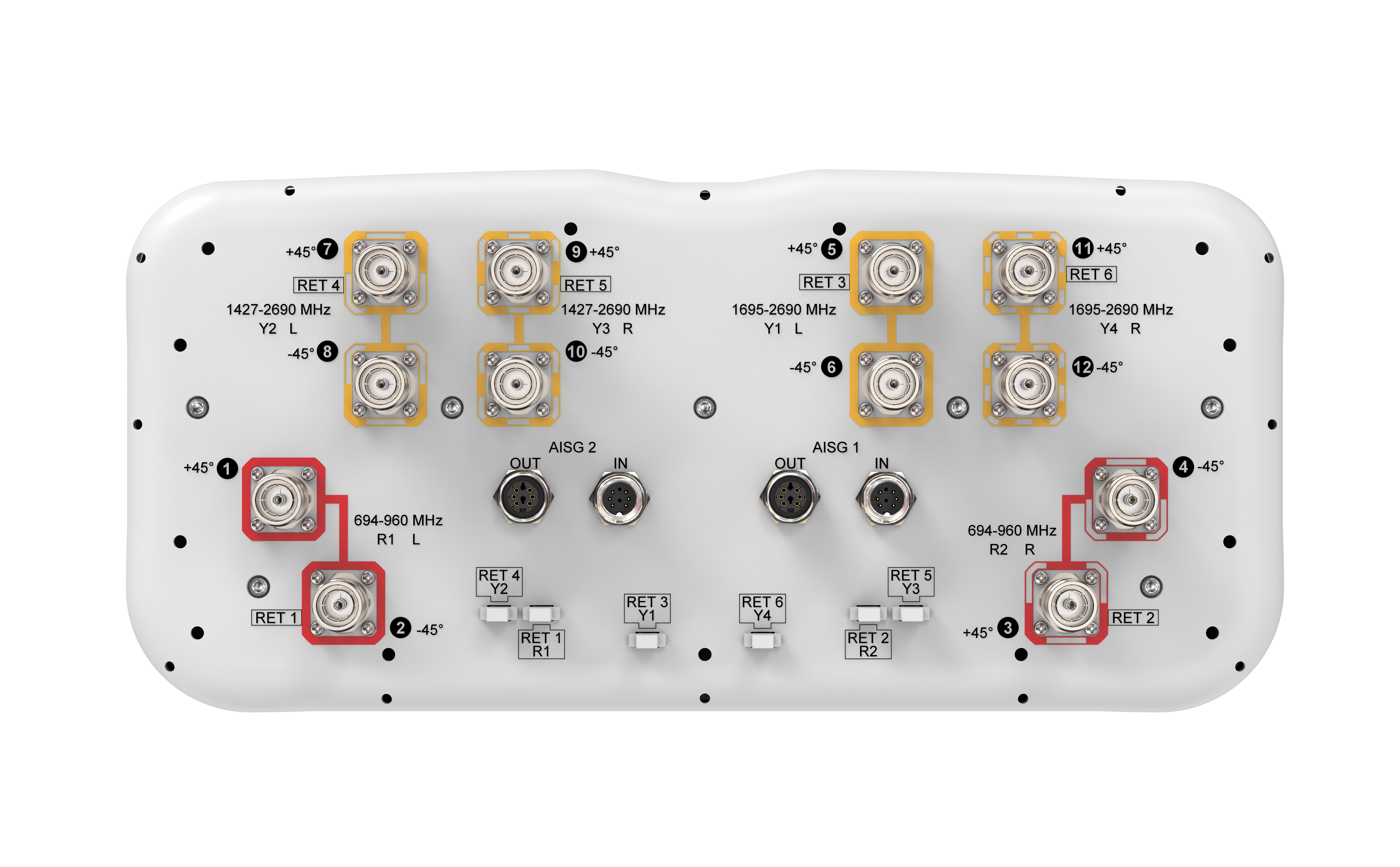 12-port sector antenna, 4 x 694–960, 4 x 1427–2690 and 4 x 1695-2690 MHz, 65° HPBW, 6x RET