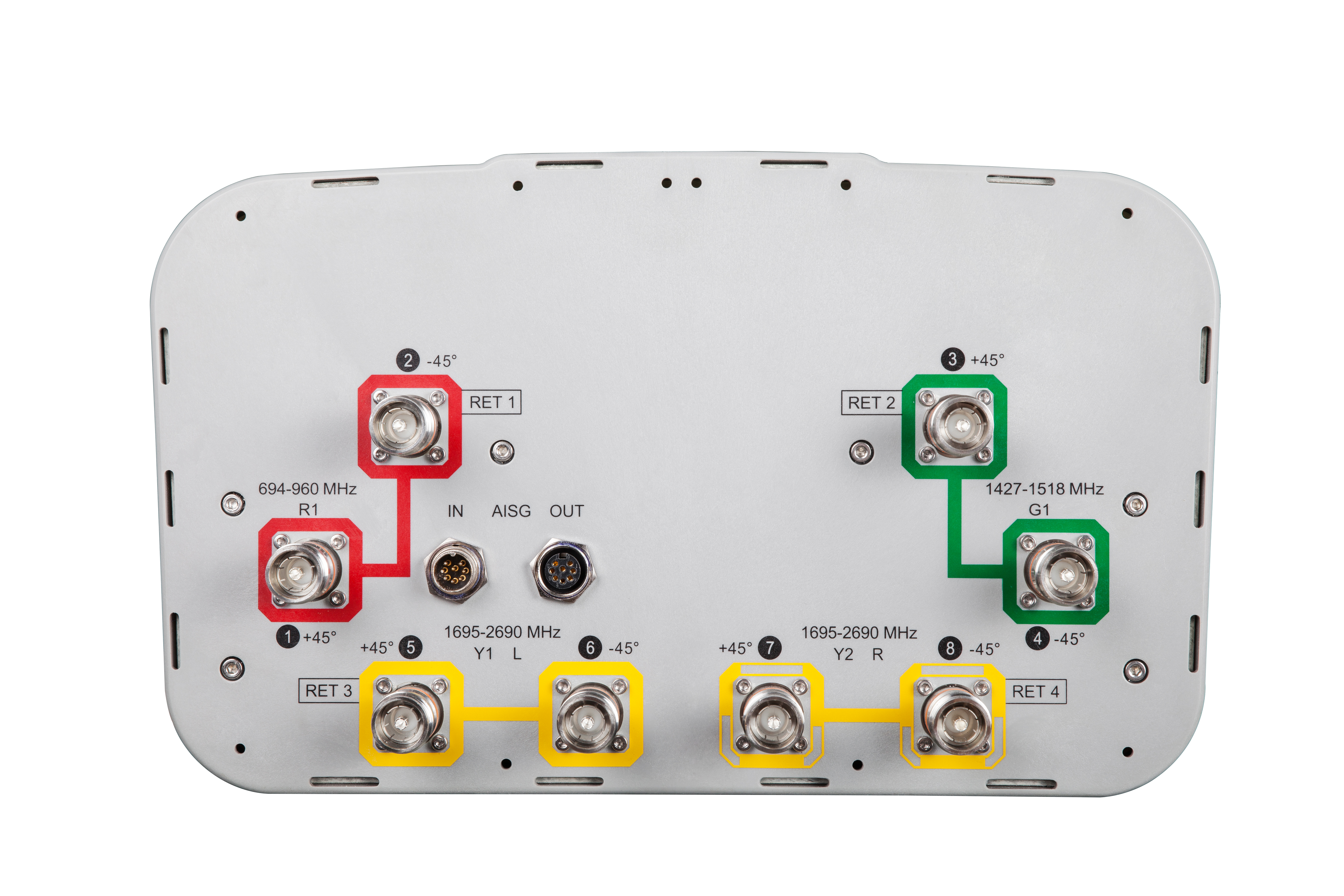 8-port sector antenna, 2x 694–960, 2x 1427-1518 and 4x 1695–2690 MHz, 65° HPBW, 4x RET