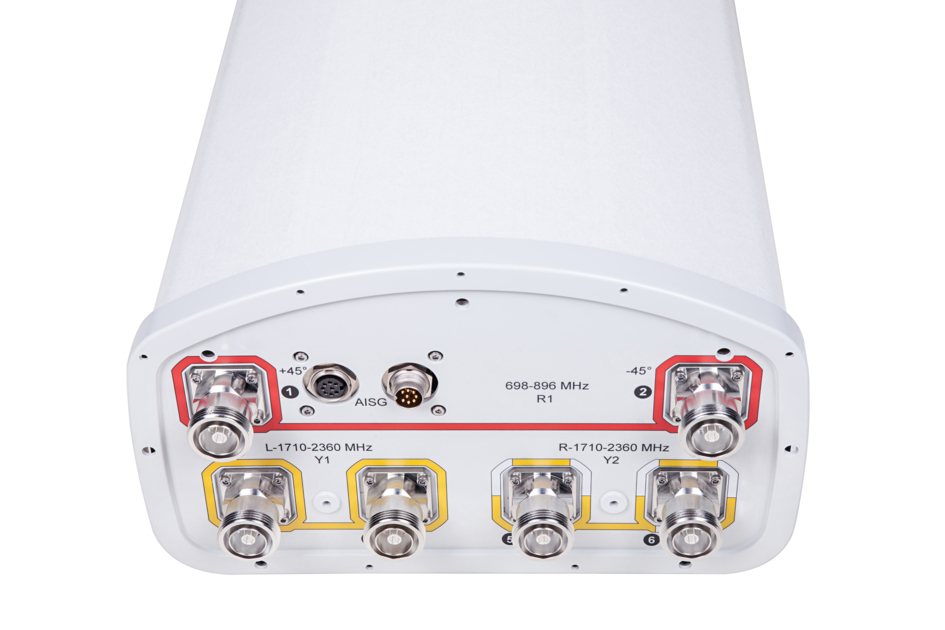 6-port sector antenna, 2x 698–896 and 4x 1695–2360 MHz, 65° HPBW, 2x RET. Both high bands share the same electrical tilt.