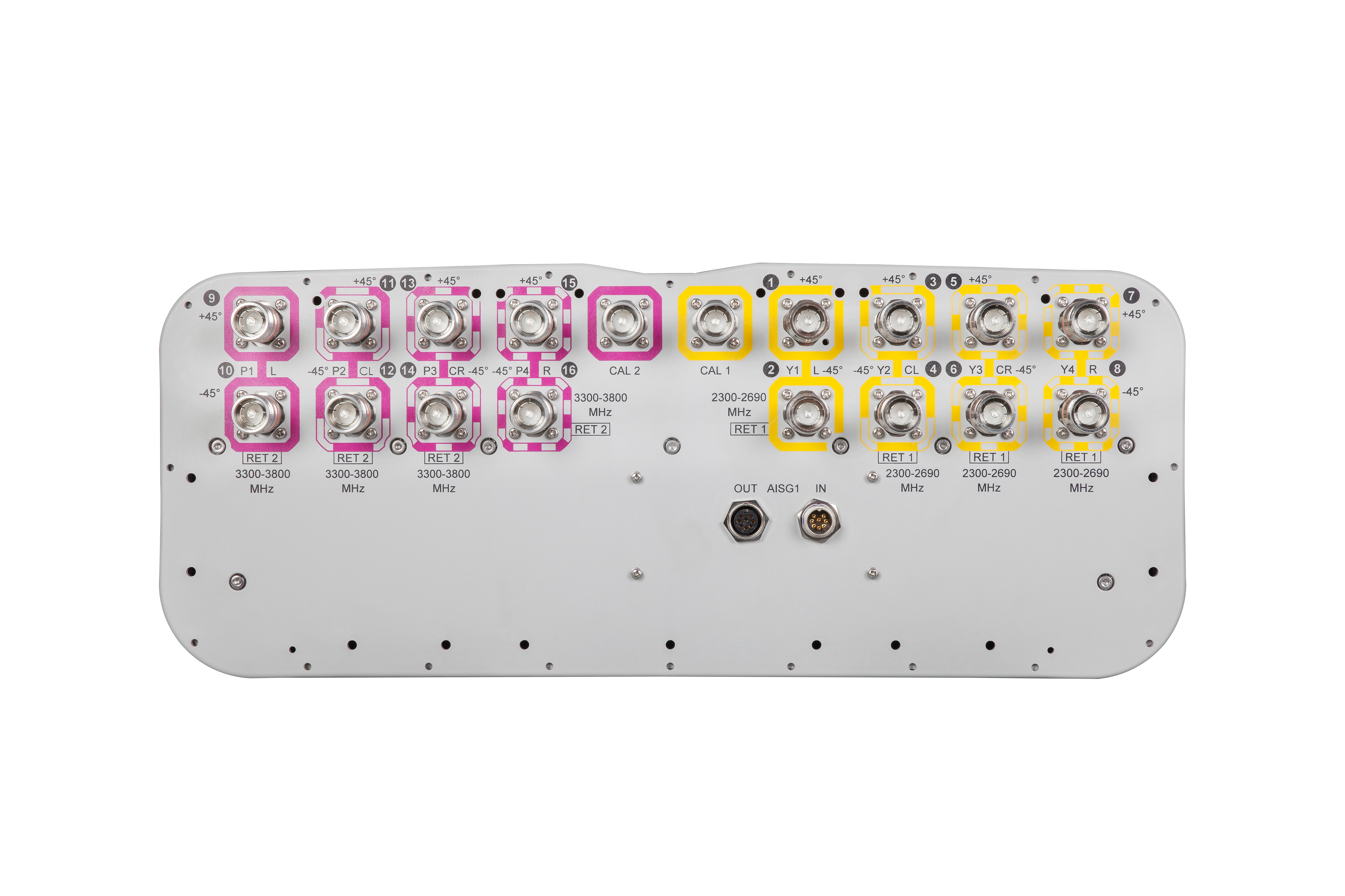 16-port Planar Array Antenna, 8x 2300–2690 and 8x 3300-3800 MHz, 90° HPBW, 2x RET