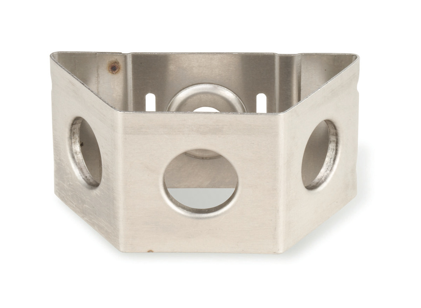 Three-Way Snap-in Stand-off Adapter has two slots for round member attachment and 3/8" holes for angle adapter integration. It includes three 3/4" holes for Snap-in hangers