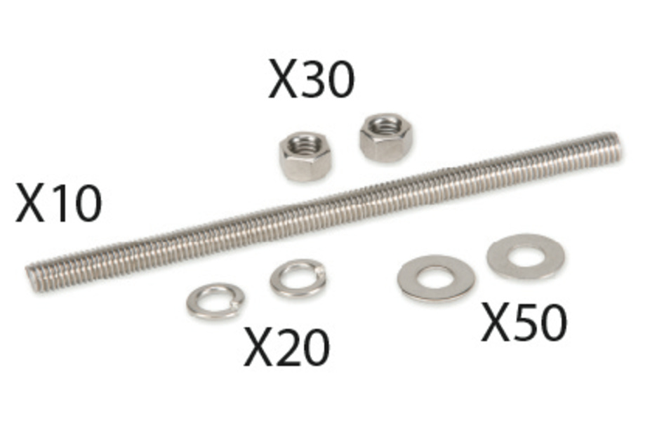| Included | Fifty flat washers | Ten 3/8 in threaded rods | Thirty hex nuts | Twenty lock washers |