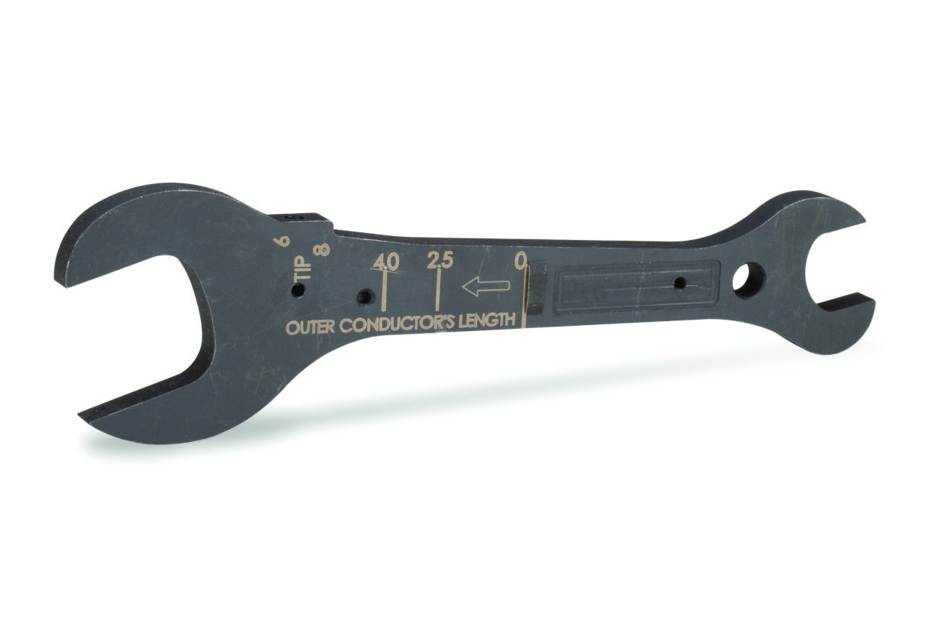Combination Tool (open end wrench for connector body, chamfer tool, file, inner conductor gauge, jacket cut-off gauge) for 1/2 in and 7/8 in coaxial cable