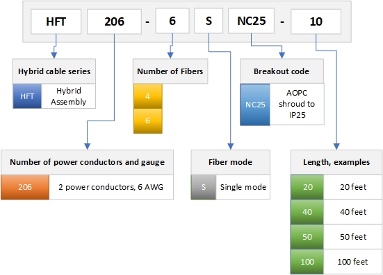 HELIAX® Hybrid Cable Assembly. End 1: six fibers within three DLC with AOPC shroud and one pair 6AWG power cord with connector installed. End two: Y- split with two IP-25 hybrid connectors.
