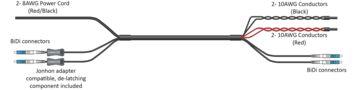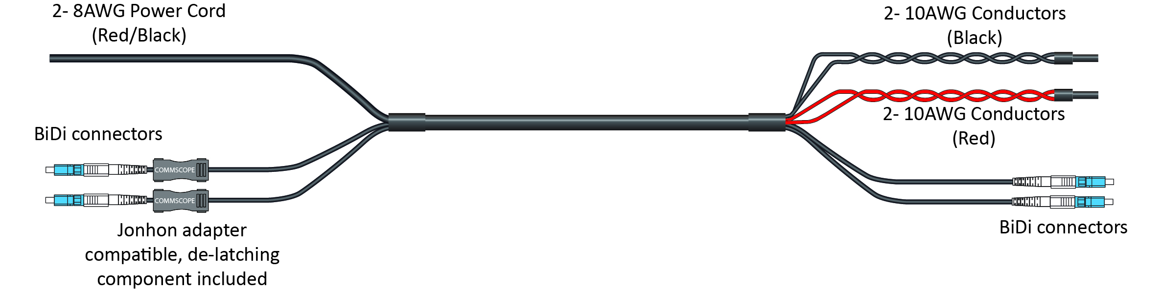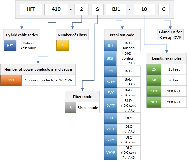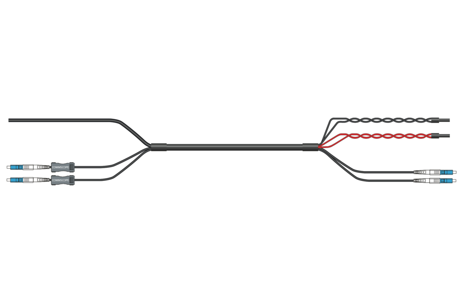 HELIAX® Hybrid Cable Assembly, 6-OVP box to RRU, Power Cord to RRU, UL Type TC-ER, 4 power conductors 8 AWG RRU, 10 AWG BBU, 2-fiber, Bi-Di, Jonhon Adapter Compatible, PVC jacket, aluminum armor, OVP gland insert kit included