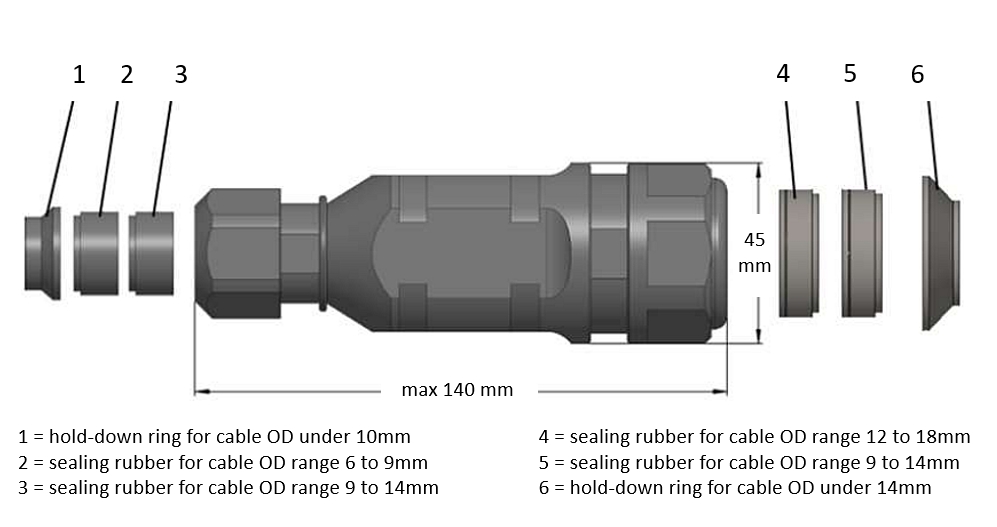 | Cable Outer Diameter | Input end: 9–14 mm and 14–18 mm | Output end: 6–9 mm and 9–14 mm |