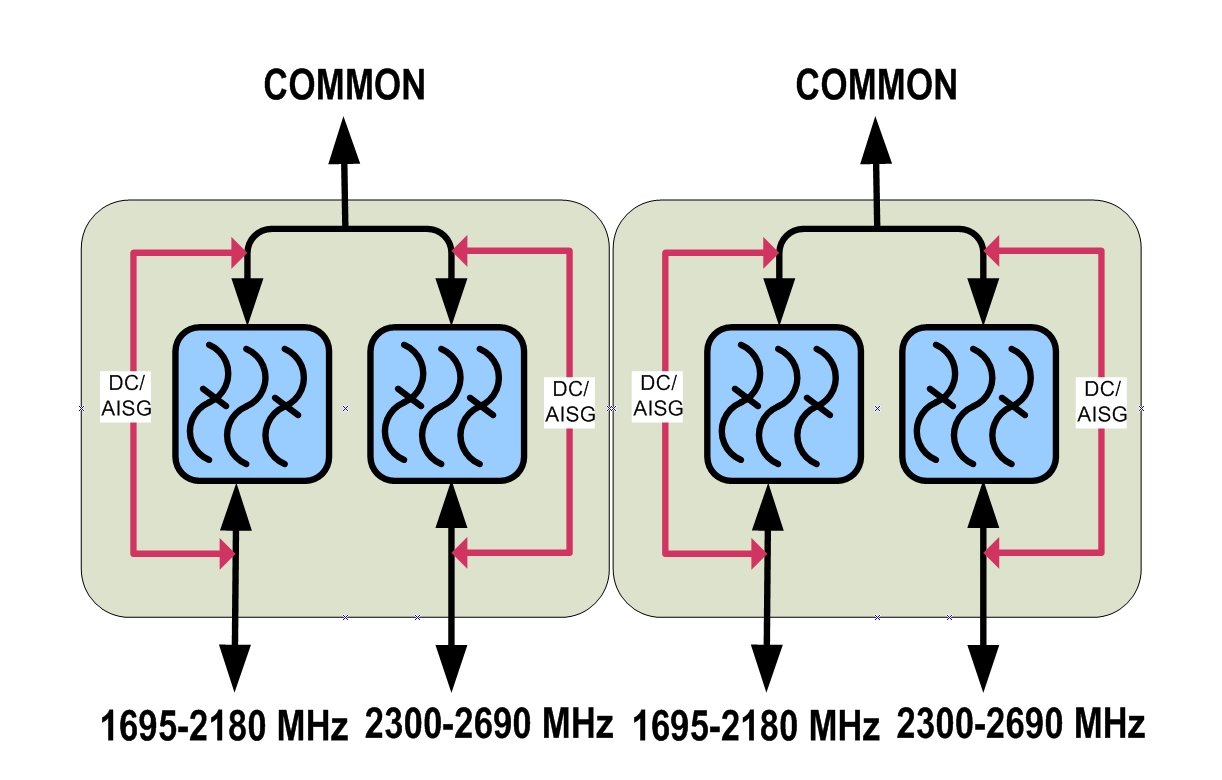 Twin Diplexer, 1695-2180//2300-2690 MHz, dc bypass all ports,AISG Compatible 1.1-2.0