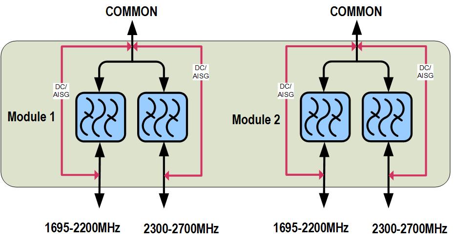 Twin Diplexer, 1695-2200/2300-2700 MHz, dc bypass all ports, 4.3-10 connectors