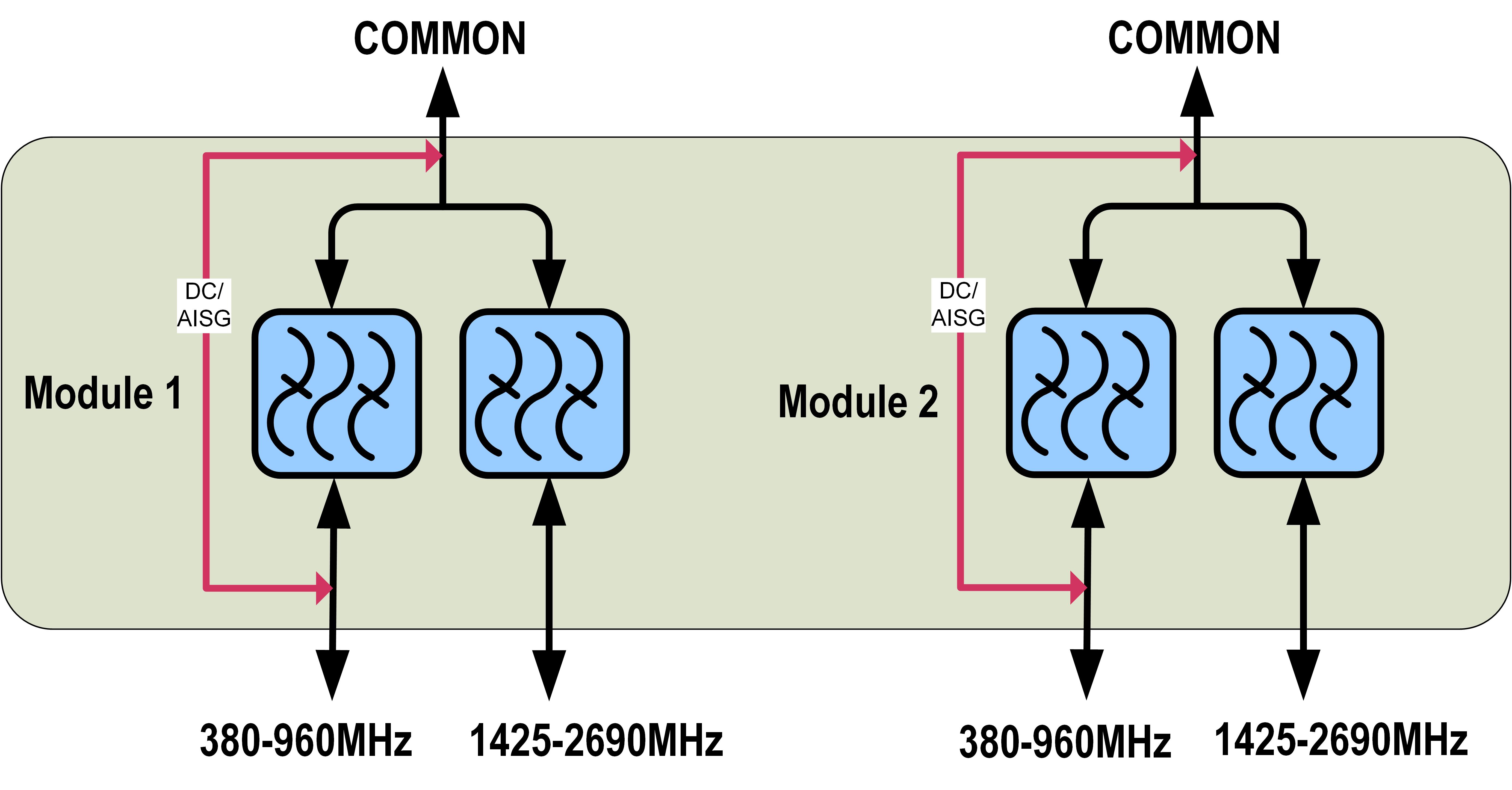 Twin 2-pak Diplexer, 380–960 MHz/1425-2690 MHz, dc pass low, with 4.3-10 connectors