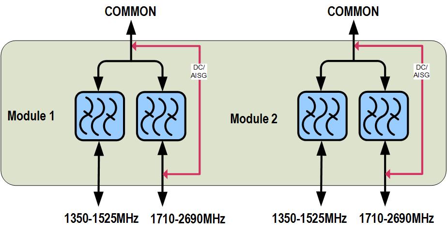 Twin 2-pak Diplexer, 1350–1525 MHz/1710–2690 MHz, DC bypass High ports, with 4.3-10 connectors