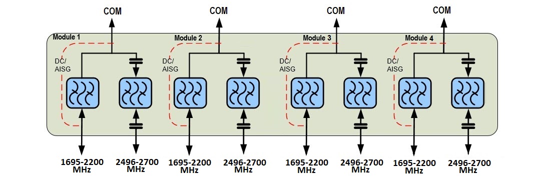 Ultra-Compact Quad Diplexer PCS-AWS/BRS, DC/AISG on PCS-AWS, NEX10 Connectors