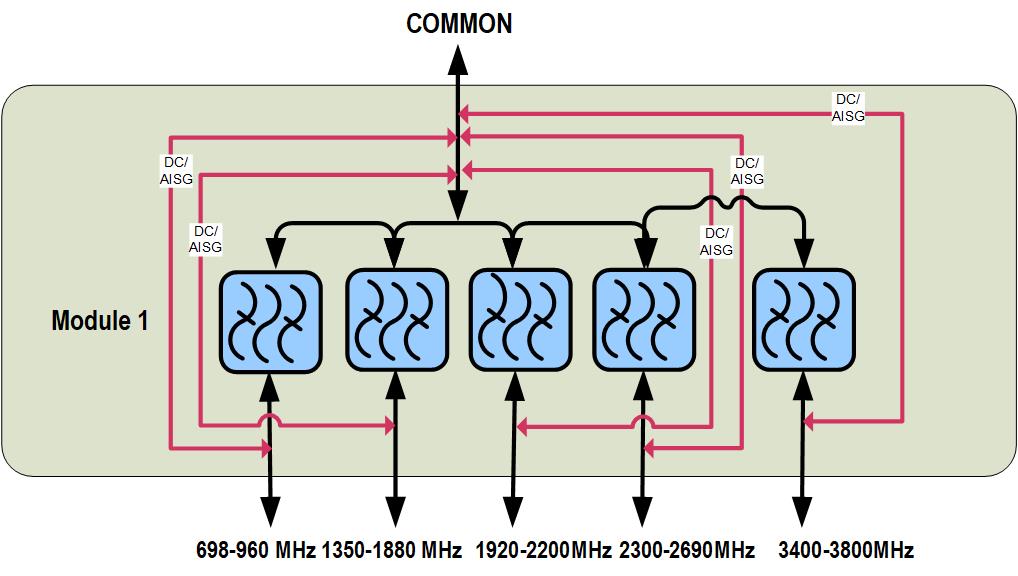 | dc/AISG Pass-through, demultiplexer | Branch 1 | Branch 2 | Branch 3 | Branch 4 | Branch 5 |