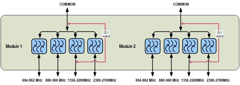 Twin Quadplexer 700-800//900//1400-2100//2300-2600 MHz, DC bypass on 1400-2100 MHz port, with 4.3-10 connectors