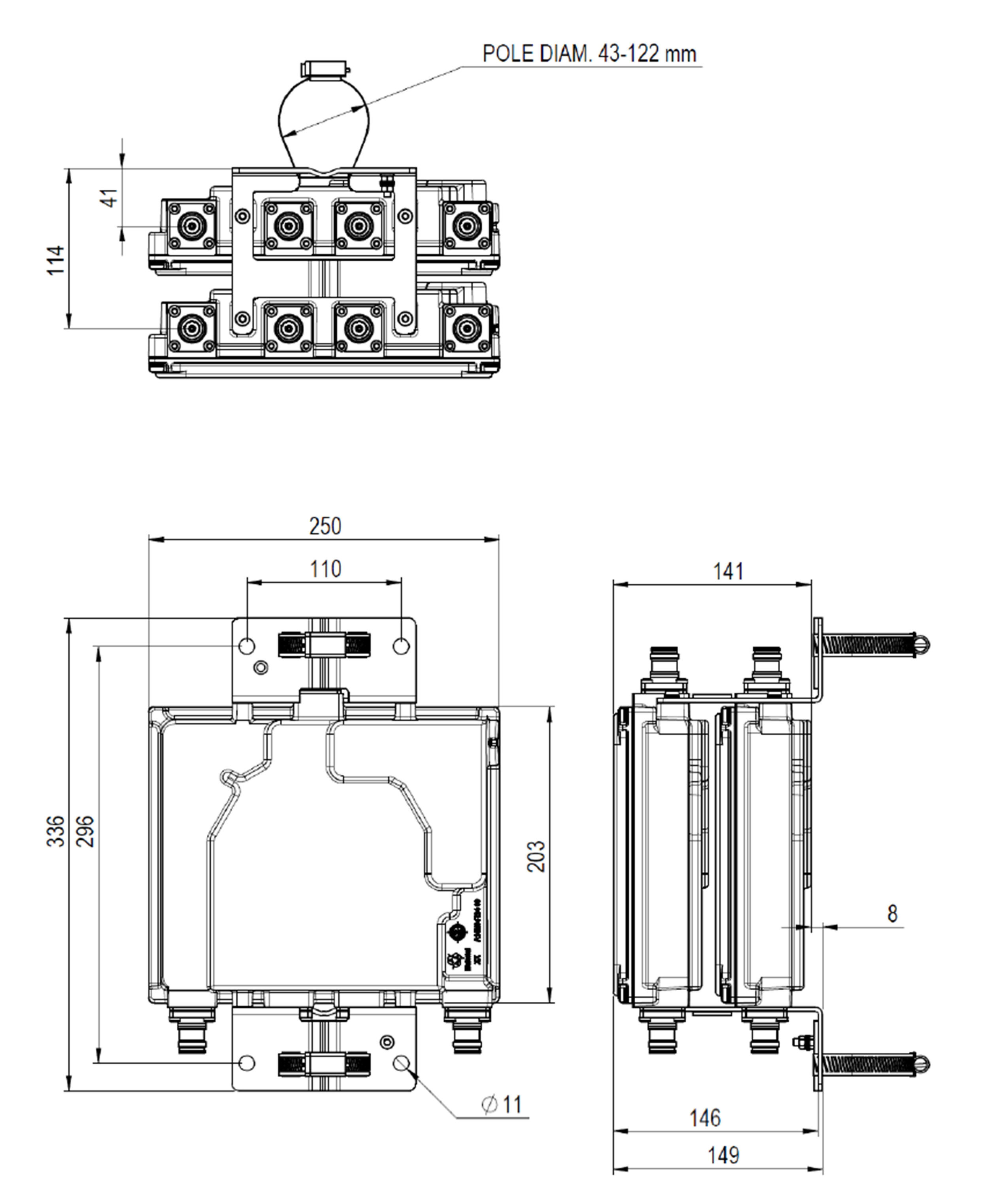 Mounting Pipe Diameter Range 42.6–122 mm