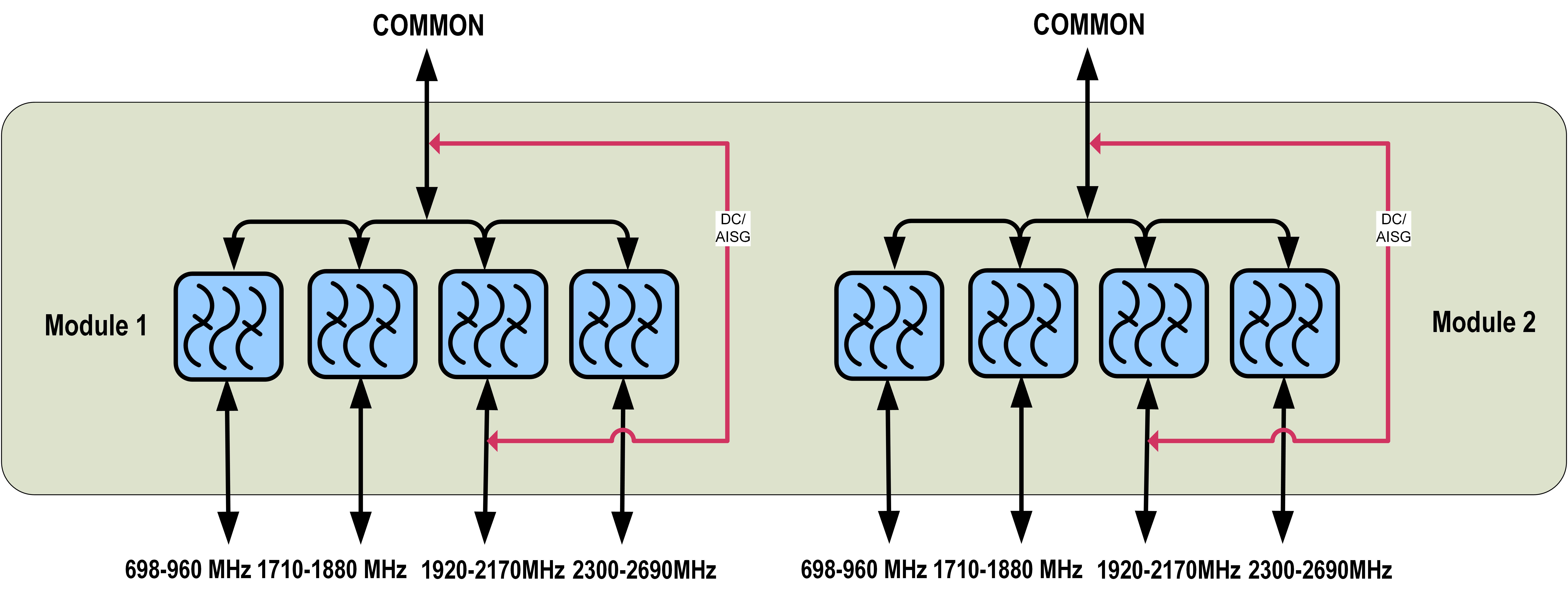 Twin Quadplexer, dc bypass on port 3, with 4.3-10 connectors