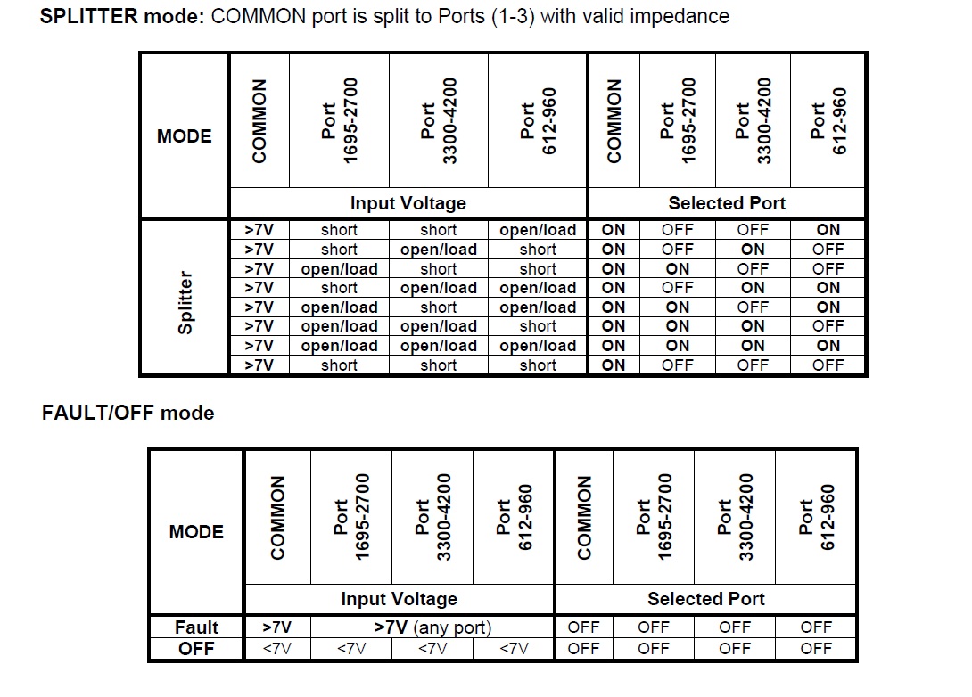 | Isolation, minimum, dB | 40 @ 1695–2700 50 @ 3300–4200 | 50 @ 3300–4200 50 @ 612–960 | 40 @ 1695–2700 50 @ 612–960 |