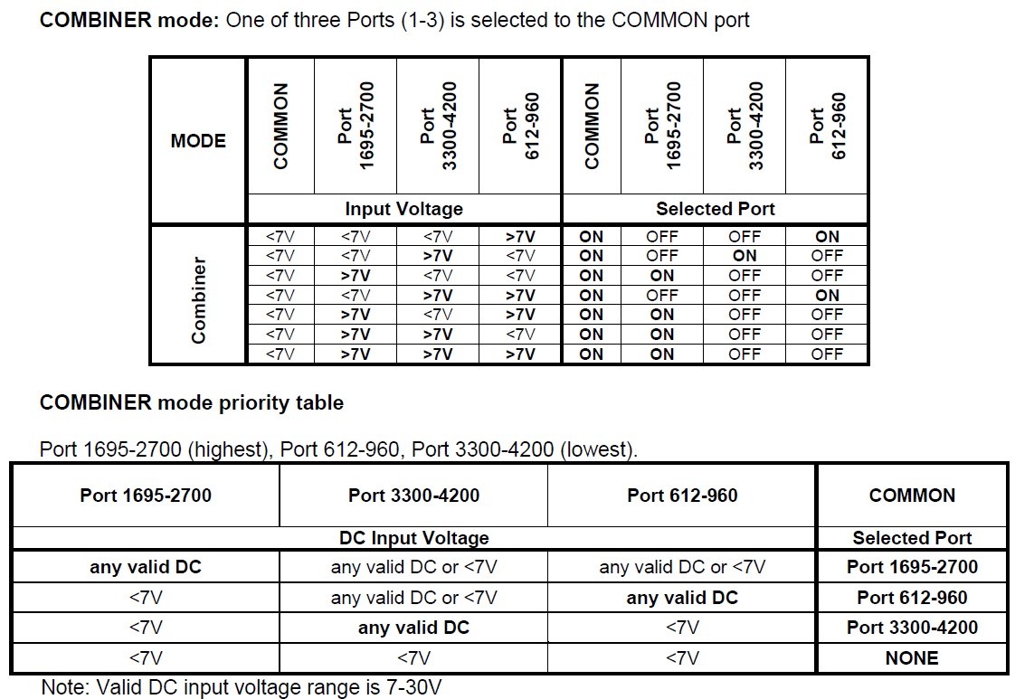 | Isolation, minimum, dB | 40 @ 1695–2700 50 @ 3300–4200 | 50 @ 3300–4200 50 @ 612–960 | 40 @ 1695–2700 50 @ 612–960 |