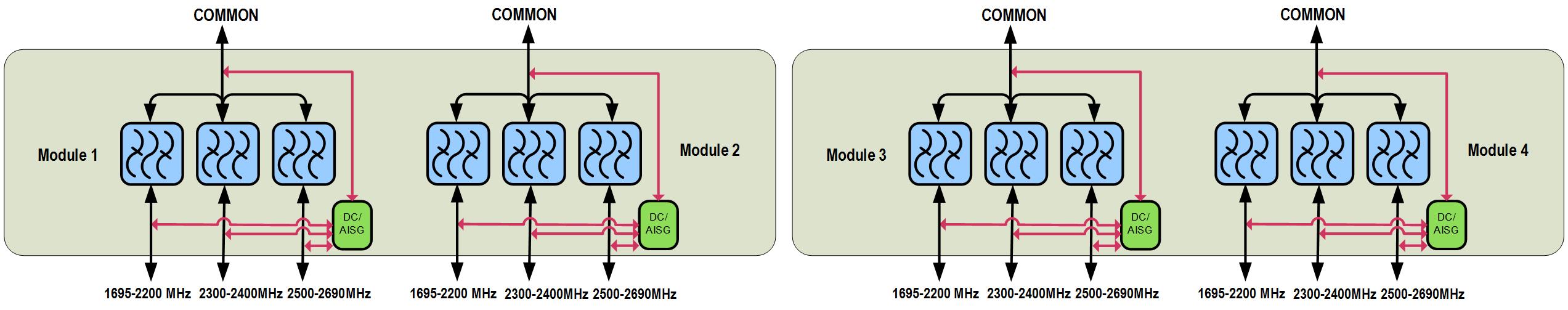 | dc/AISG Pass-through Path | Auto sensing circuitry detects dc/AISG signal presence and selects path |